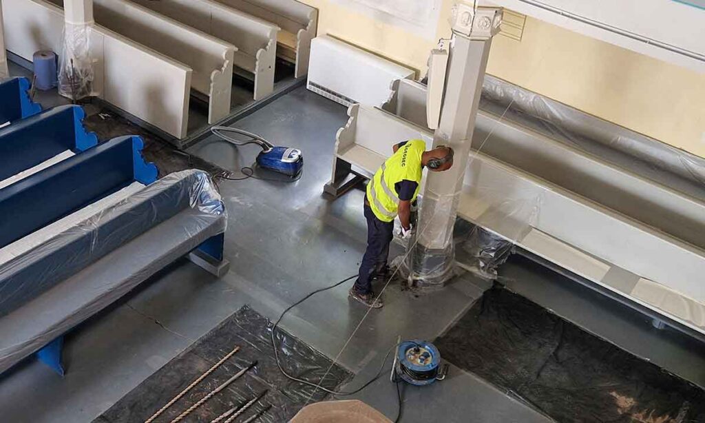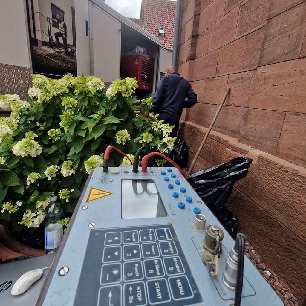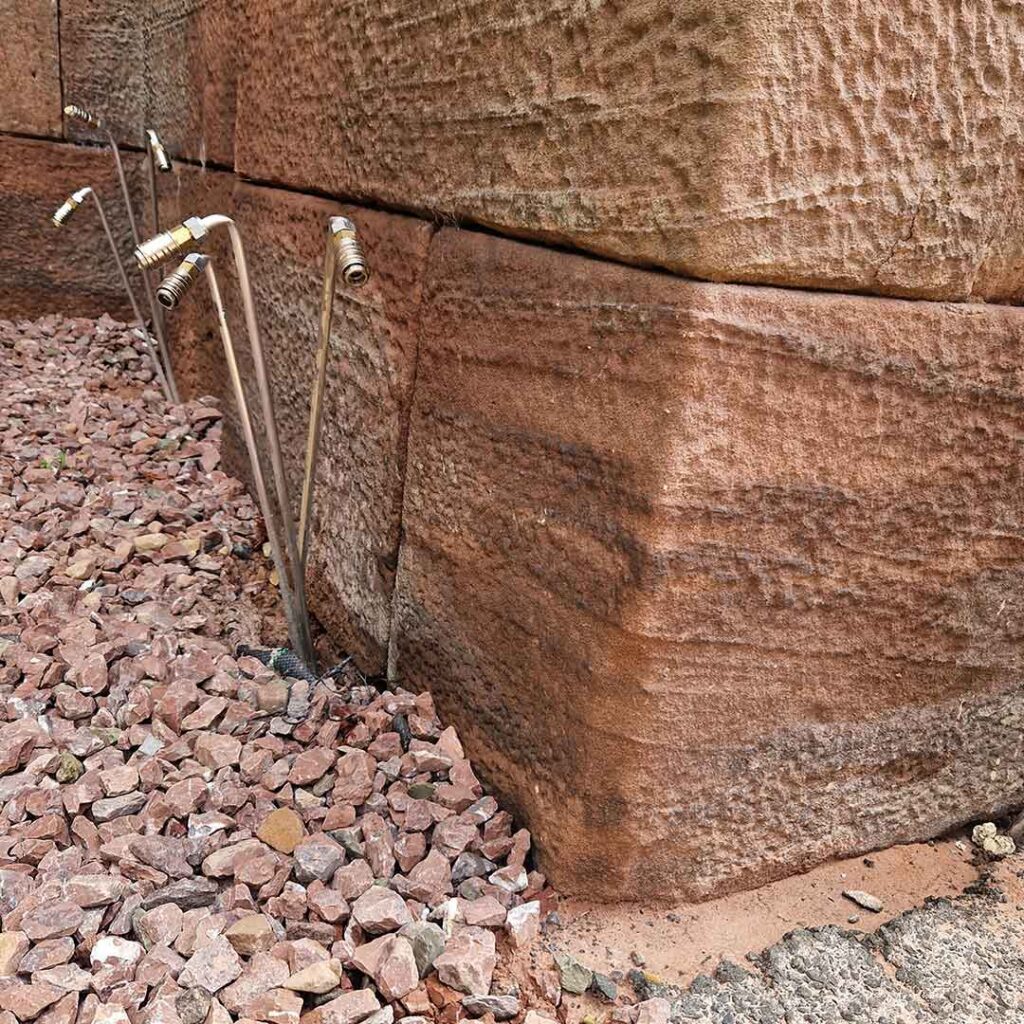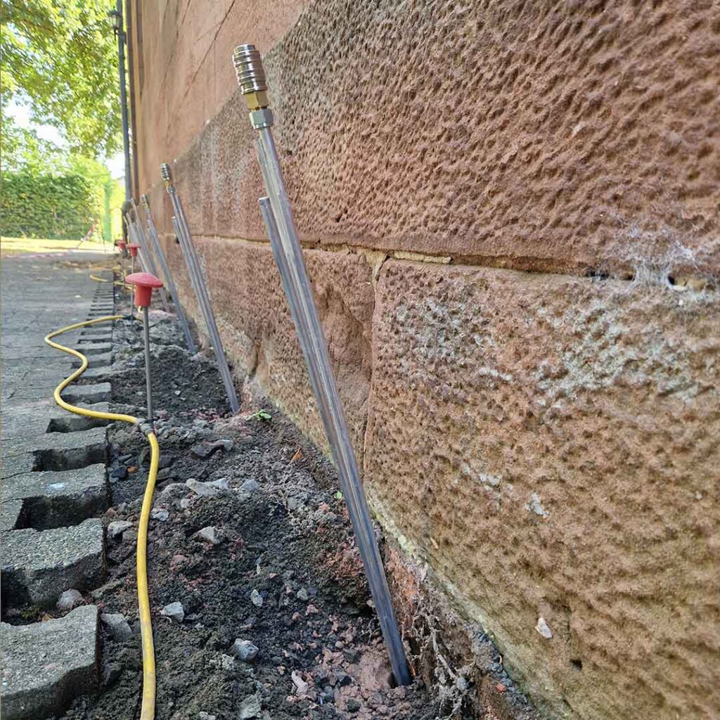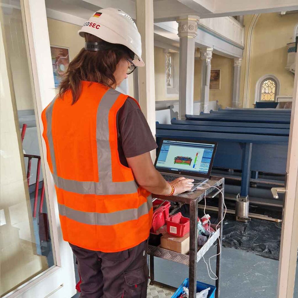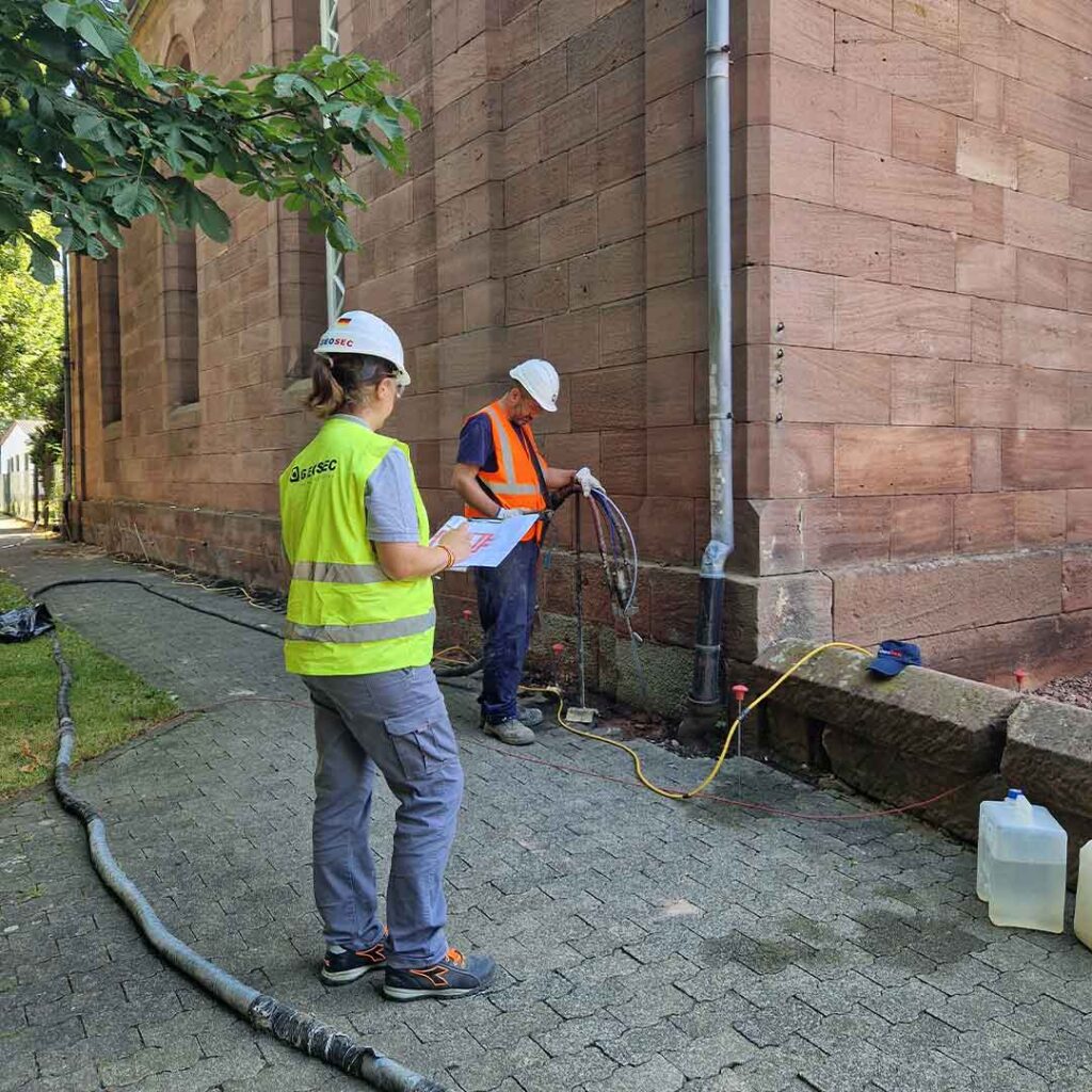Um das historische Bauwerk dauerhaft zu sichern, mussten die lockeren Schichten stabilisiert werden, ohne das Gebäude durch schwere Bauarbeiten weiter zu belasten. In solchen Fällen verwendet GEOSEC das innovative SEE&SHOOT®-Verfahren, welches umweltverträgliche Polyurethanharze mit einer präzisen und kontrollierten Auffüllung verbindet. Dabei wird zuerst anhand von Ramm-Sondierungen (DPM) die mechanische Festigkeit des Baugrunds ermittelt. Im Anschluss folgt eine 4D elektrische Widerstandstomographie, welche es ermöglicht die Hohlräume unter der Erde zu identifizieren und so die Einsatzbereiche festzulegen. Schlussendlich wird ein spezielles Kunstharz zur Baugrundverfestigung direkt in die instabilen Bereiche injiziert.