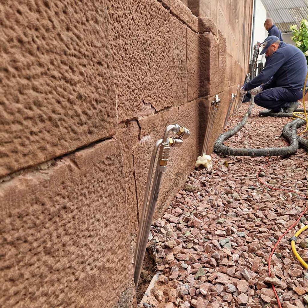 Mit der patentierten GEOSEC-Methode werden Untergründe von Bauwerken effizient, minimal-invasiv und langanhaltend stabilisiert